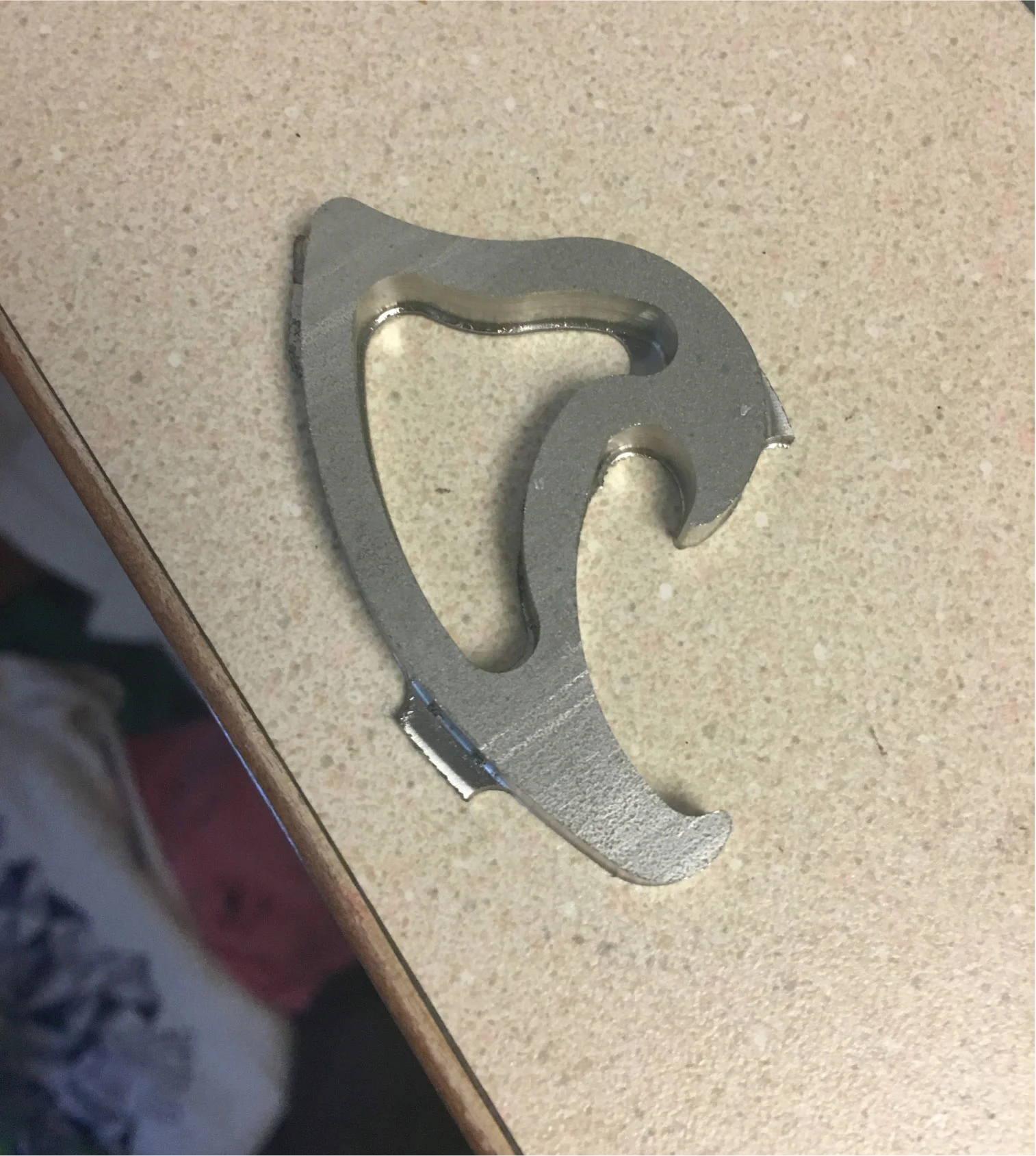 My fixturing for the bottle opener consisted of a pin hole, a pin slot, and two bolts. I left room to machine more than one bottle opener from my stock.